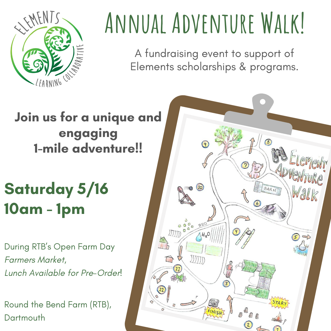 Each spring, Elements Learning Collaborative hosts our Annual Adventure walk! Guests follow a 1-mile course around the farm with 10 fun and educational challenges along the way.